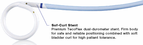 Soft TecoFlex stent with specially designed bladder curl. The multilength concept allows for patient adjusted placement from 22-28 cm.