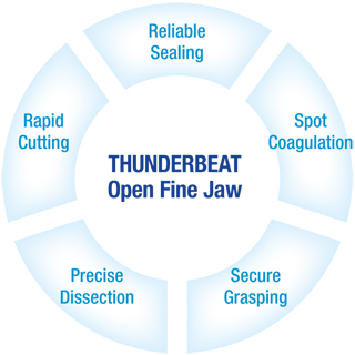 The THUNDERBEAT Open Fine Jaw maintains the general philosophy behind the THUNDERBEAT technology, and the instrument has been specifically designed for open surgical procedures that requires delicate and fine tissue dissection particulary in superficial and confined area, such as in thyroidectomy, breast procedures and various of open procedures requirng delicate and precise tissue dissection. The result is a highly ergonomic instrument that cuts tissue fast, seals vessels safely and securely, and allows for extremely fine tissue dissection and spot coagulation.